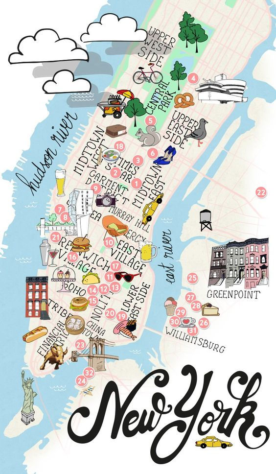 Pour organiser nos journées on a simplement sélectionné pour chaque jour un quartier de Manhattan qui nous intéressé; je me suis énormément inspiré de Pinterest et notamment de ce plan super pratique du Blog PopandSoda pour faire ma sélection :
